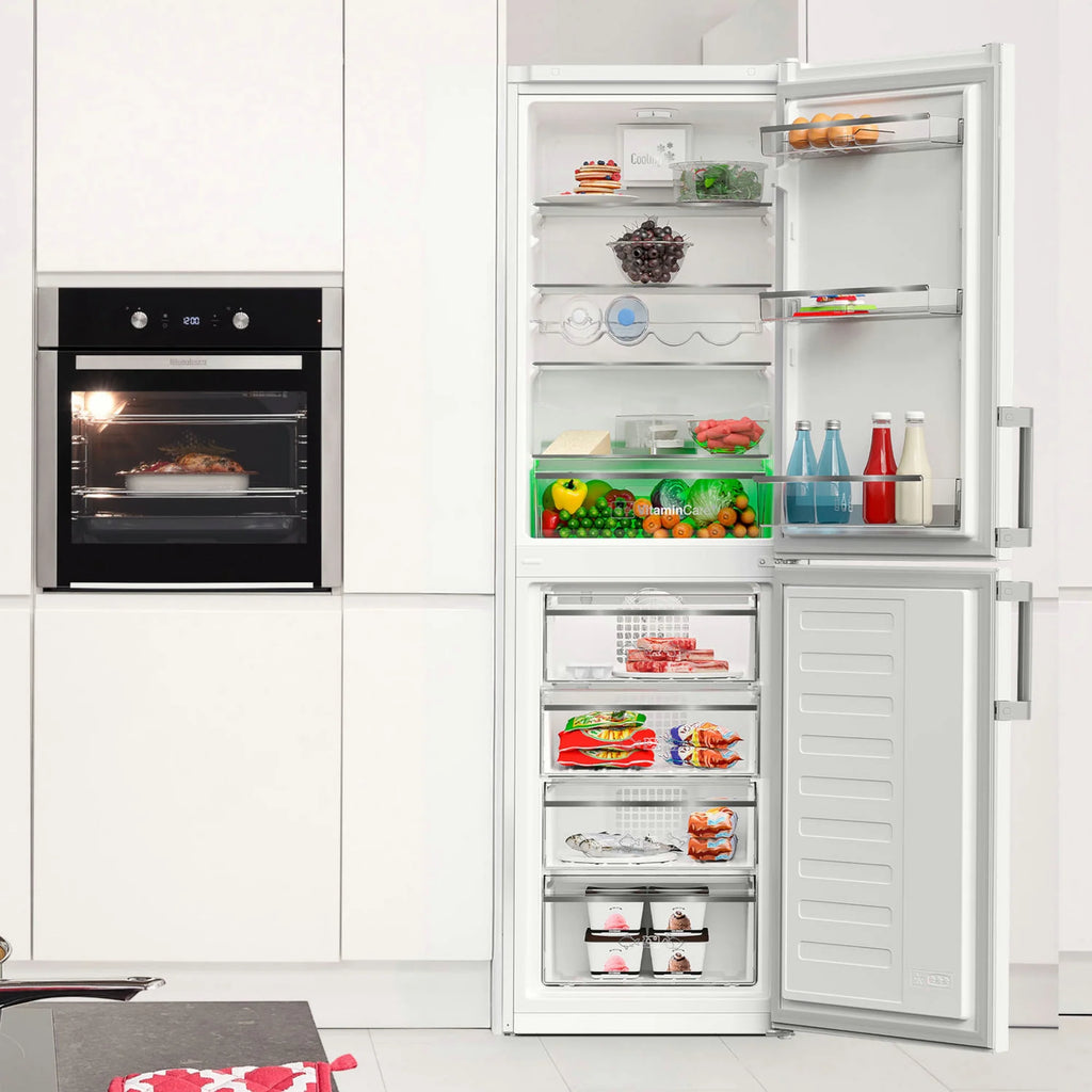 Unpack the family’s groceries into the Blomberg KGM4574V fridge freezer, a practical and stylish solution for modern households. This freestanding frost-free appliance comes in a classic white finish, blending effortlessly into any kitchen décor.