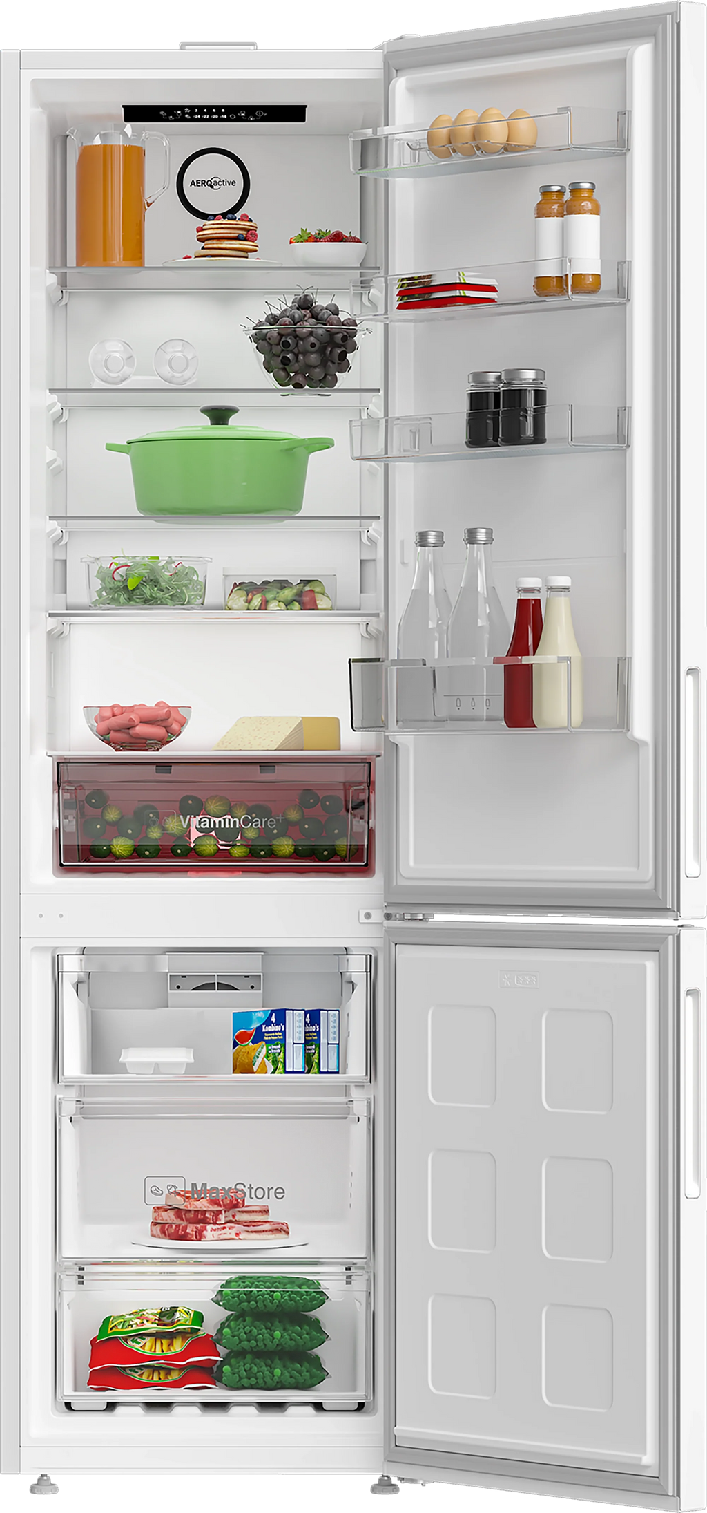 Keep your fruit and vegetables fresher for longer with VitaminCare+, a three-colour LED system in the crisper drawer that mimics natural daylight cycles to preserve essential nutrients. AeroActive Dual No Frost provides even cooling throughout the fridge and freezer compartments while eliminating the need for manual defrosting.