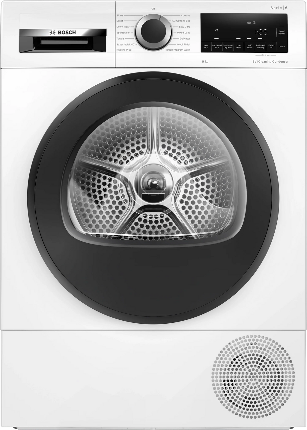 The Bosch WQG24509GB Series 6 freestanding condenser tumble dryer offers efficient, convenient drying with a spacious 9kg drum – perfect for busy households. Finished in sleek white, it includes a range of smart features to protect your fabrics and make laundry day easier.