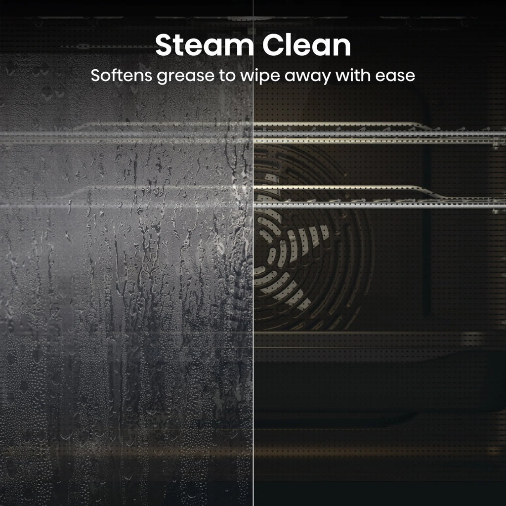 Convenience is enhanced by the Steam Clean function, which softens grease and grime using steam, allowing effortless cleaning with just a wipe-down. User-friendly dial controls, an LED digital display, and a programmable timer simplify operation. The removable double-glazed glass door helps retain heat and is easy to clean, making maintenance hassle-free.