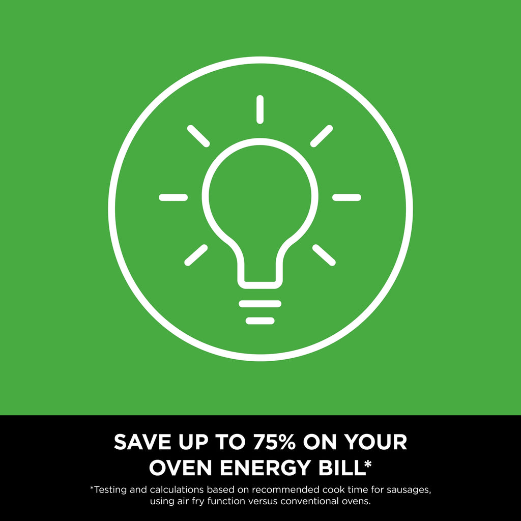 Additional Information | Power Consumption: 2400W Save up to 75% on your energy bill*, *testing and calculations based on recommended cook time for sausages, using air fry function versus conventional ovens |