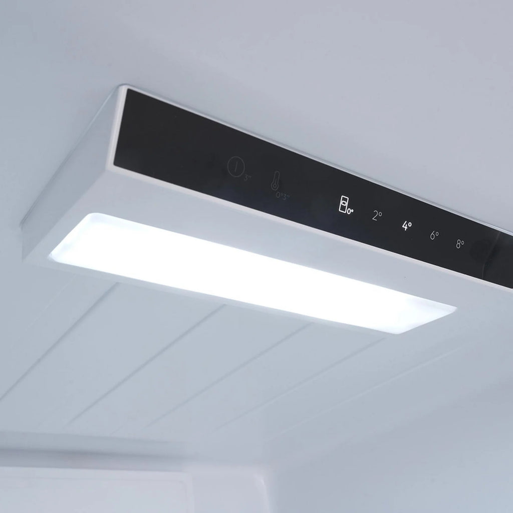 The fridge section provides a spacious 235 litres of usable space across four tempered glass shelves, adjustable door balconies, and a full-width fruit & veg crisper drawer. The integrated LED light helps you easily locate items, even when fully stocked.